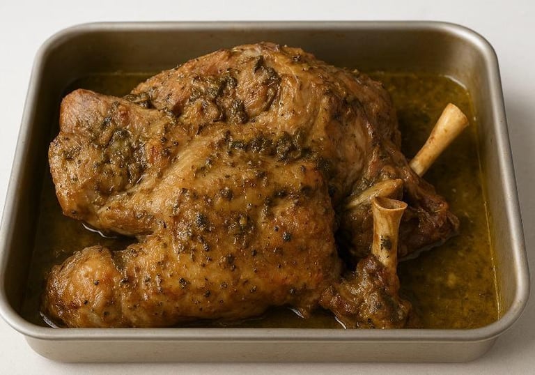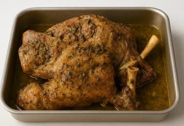 Sobrecoxa com molho de vinho branco e cogumelos.